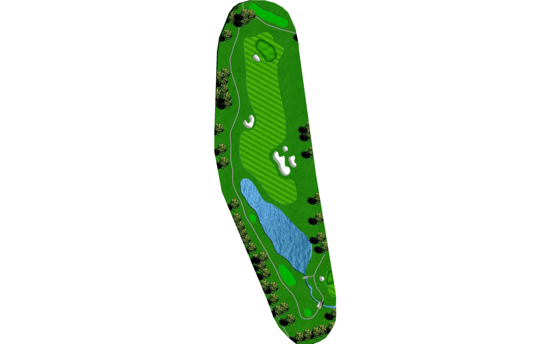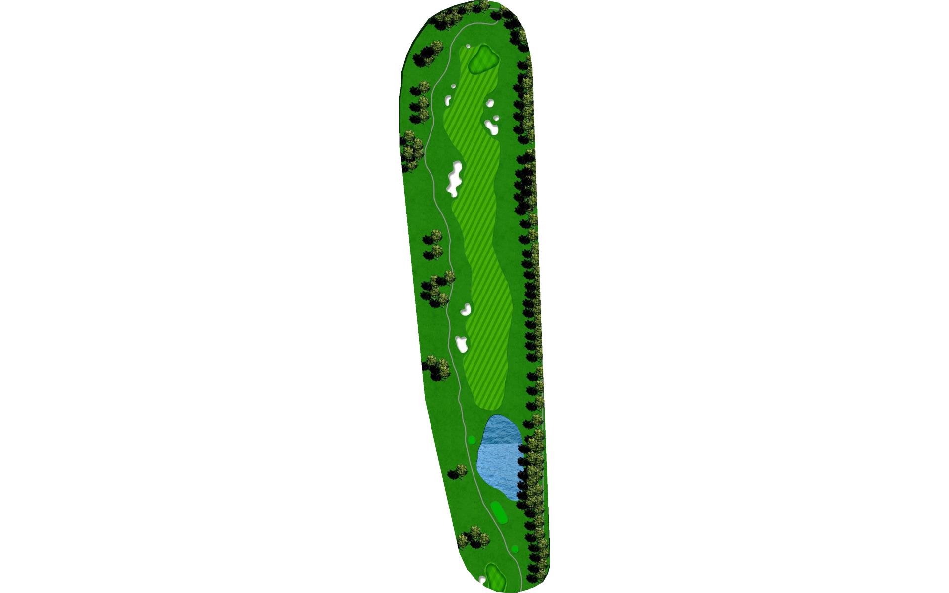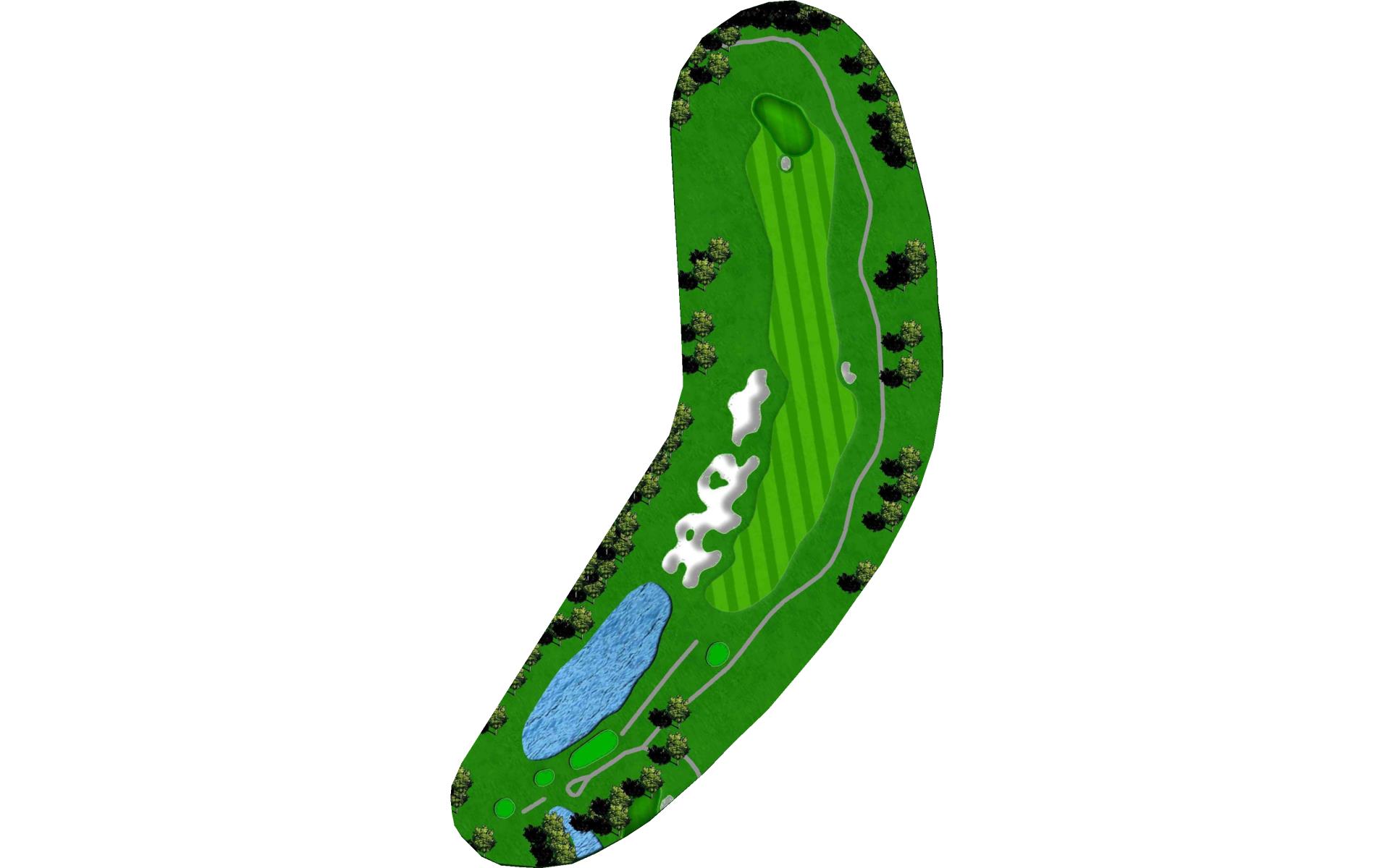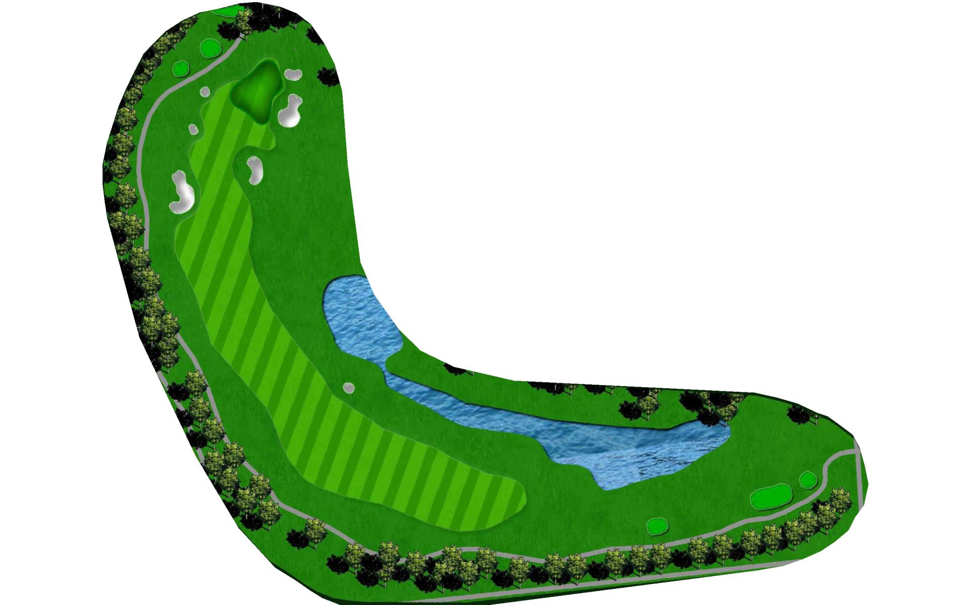 | This long dogleg left par 4 requires players to carry the water on their drive to a landing area flanked by fairway bunkers. The approach shot must avoid the large greenside bunker on the left. |