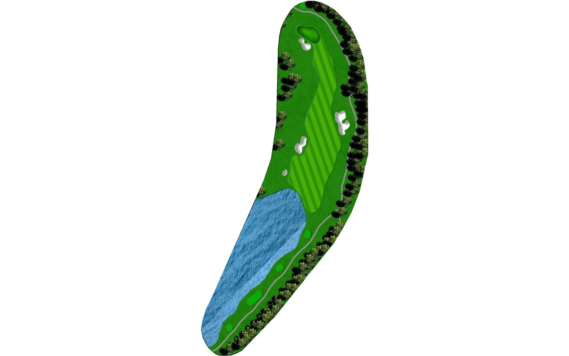 | The green on this strong par 3 features three-tiers and is protected in front by water and a small pot bunker on the front-right edge. A swale at the center of the green will feed balls down to a lower fairway next to the water. |