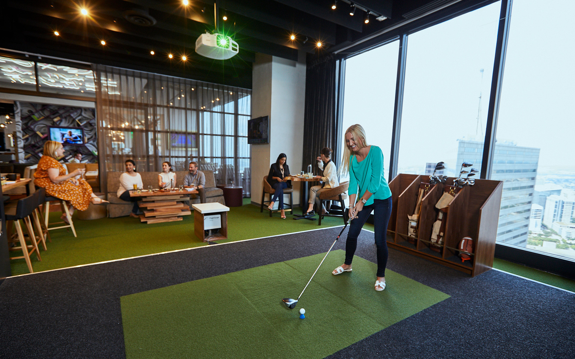 The Swing Suites Golf Lounge offers brand-new virtual golf Dallas players are sure to love and a social hub like no other. Here, Members and guests will enjoy a stylish and comfortable lounge complete with tee boxes, a great selection of virtual golf games (like pinball, knockout and weekly live play challenges!) and handcrafted food and drinks.